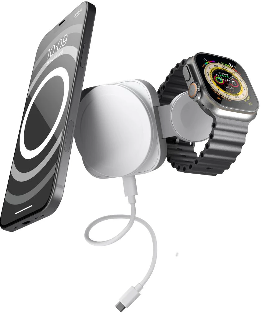 Das 2-in-1-Reiseladegerät MagSafe + Watch ist das vielseitigste und kompakteste Ladegerät sowohl für das iPhone als auch für die Apple Watch. Auf der Vorderseite des Ladegeräts befindet sich ein MagSafe-Lademodul, das das iPhone 12 und höher mit bis zu 15 W Leistung auflädt. Auf der Rückseite befindet sich ein Ladegerät für die Apple Watch. Das Aufladen unterwegs war noch nie so einfach. Bitte beachten Sie, dass kein Netzteil im Lieferumfang enthalten ist.